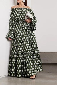 Vestido midi con escote bardot elástico y manga larga con volante en el puño con corte en la cintura. Estampado floral de campanillas blancas sobre fondo verde oscuro.