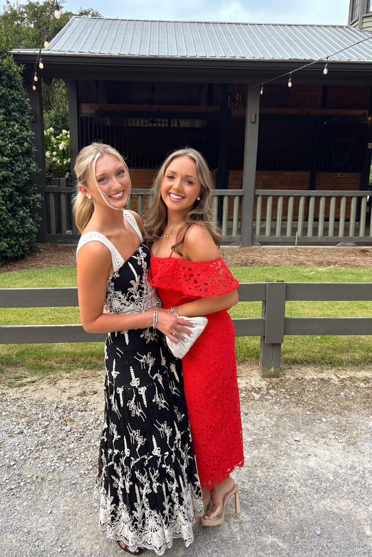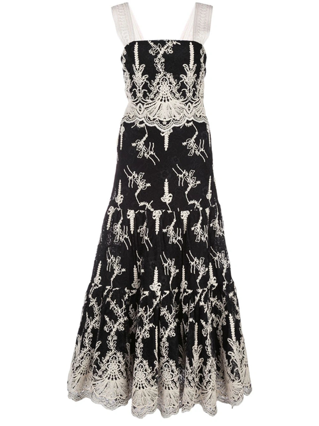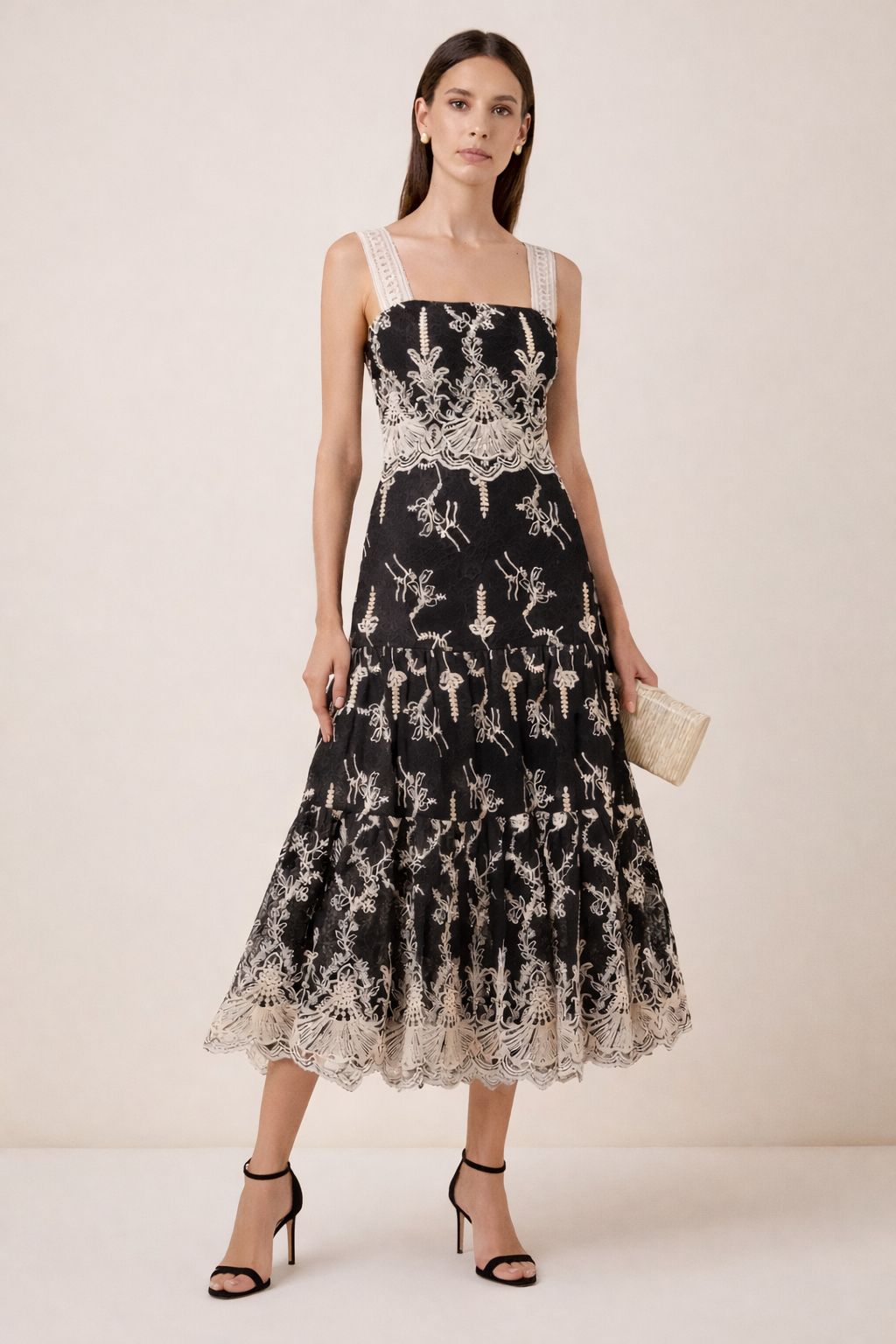 Vestido midi con escote recto y tirantes anchos. Con cuerpo entallado y falda amplia en capas con bordado floral en contraste.
