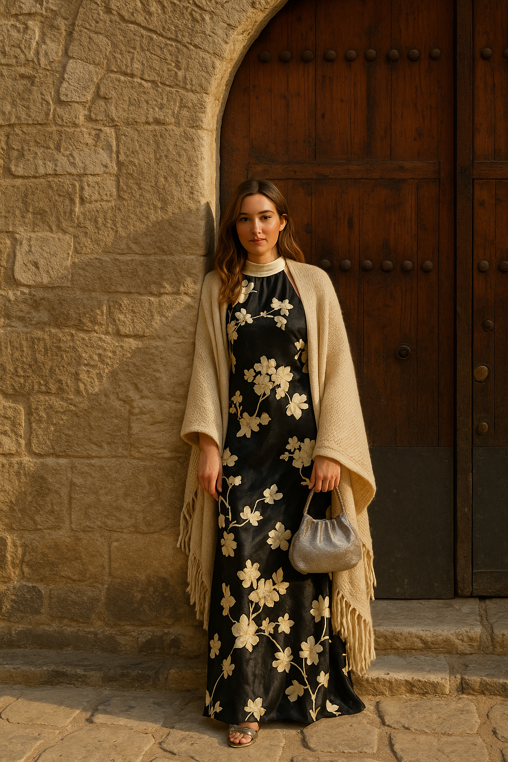Vestido Midi negro detalles florales en blanco y cuello blanco.