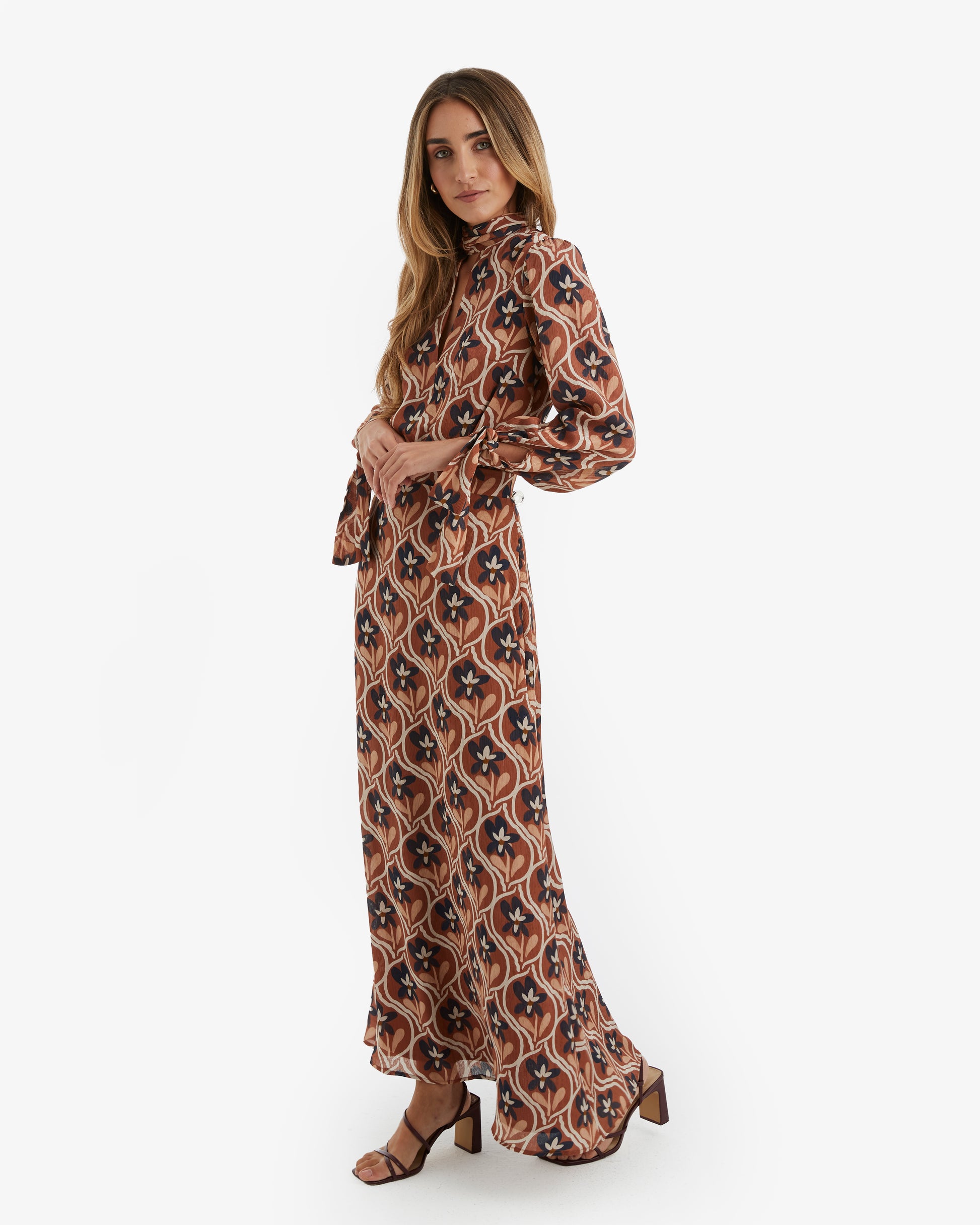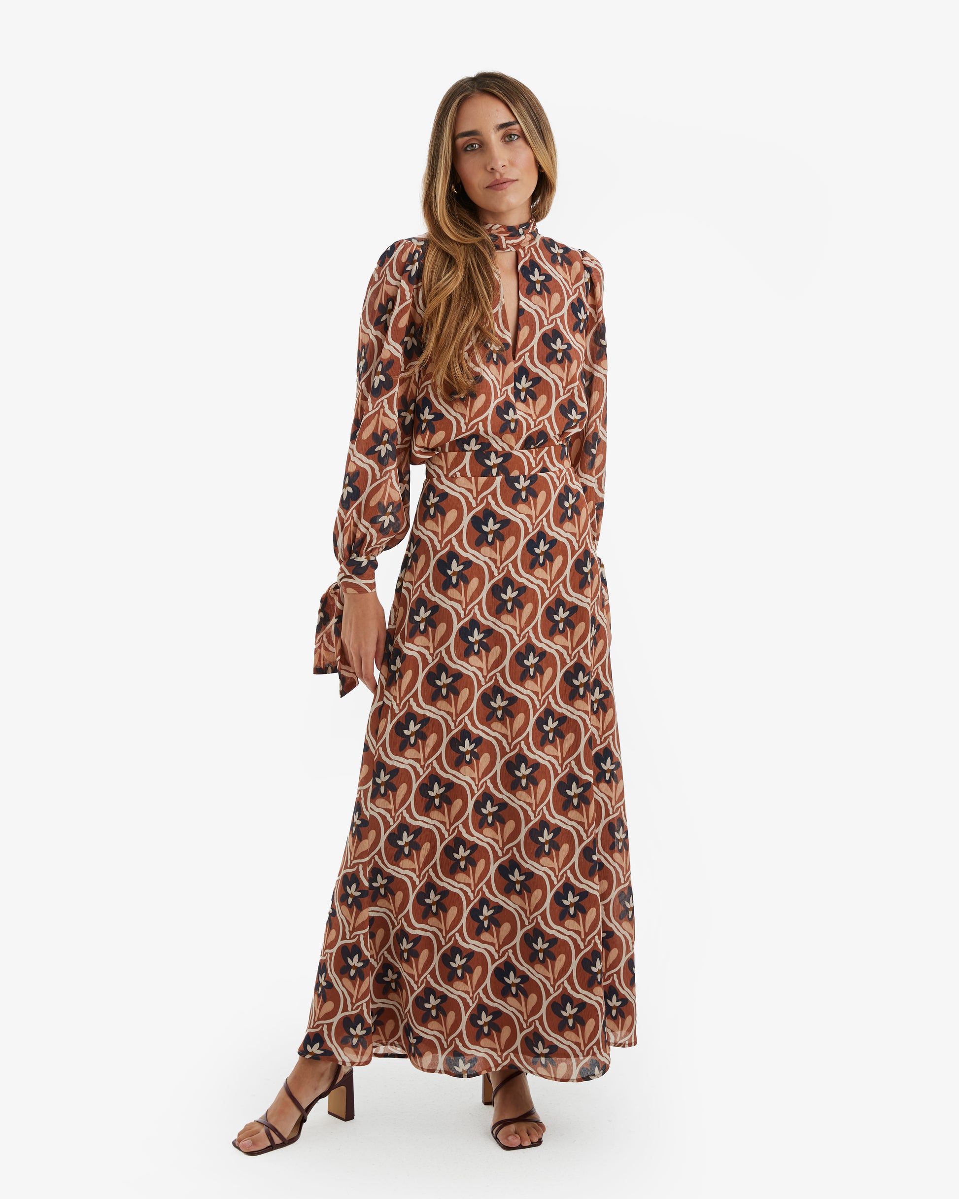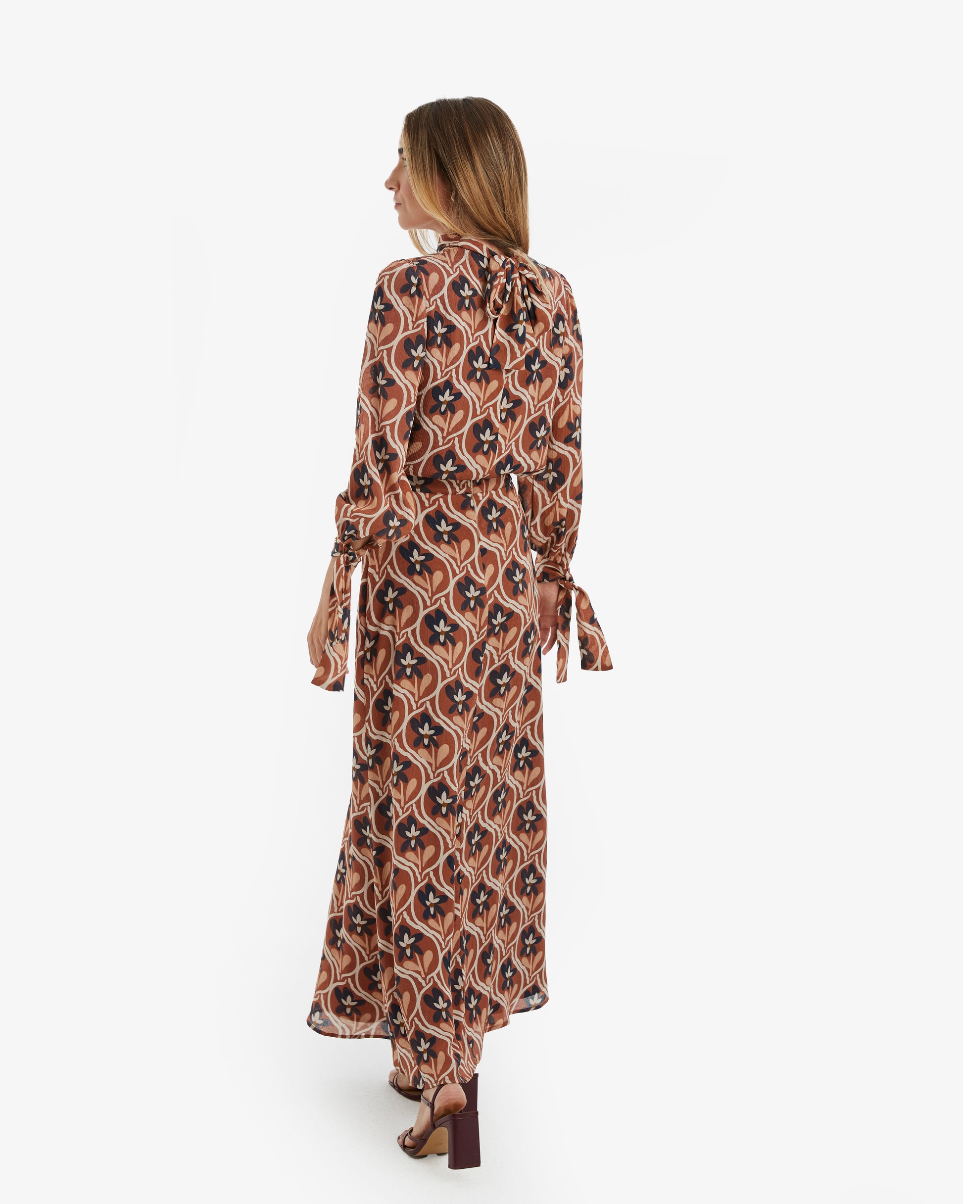 Conjunto dos piezas de blusa y falda maxi. Con tonos marrones y estampado floral . Apertura en el escote.