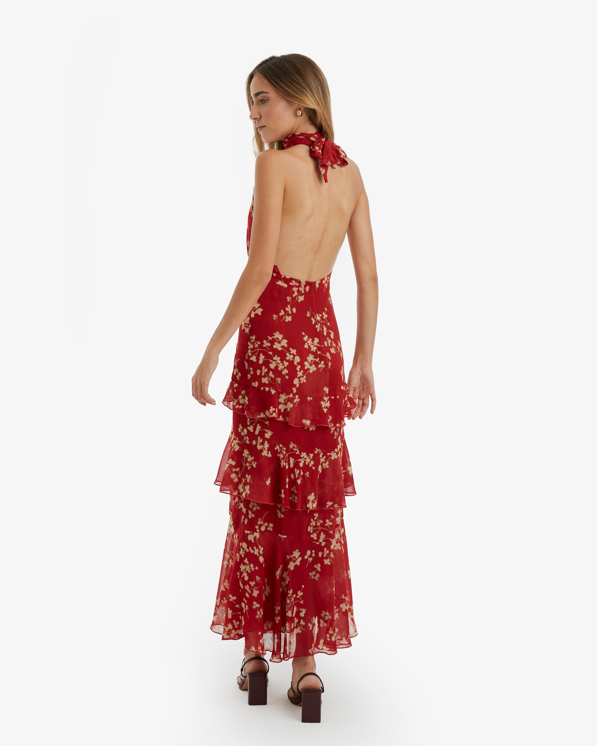 Vestido largo rojo con estampado floral en beige. Escote en V, falda con volantes y foulard de gasa a juego.