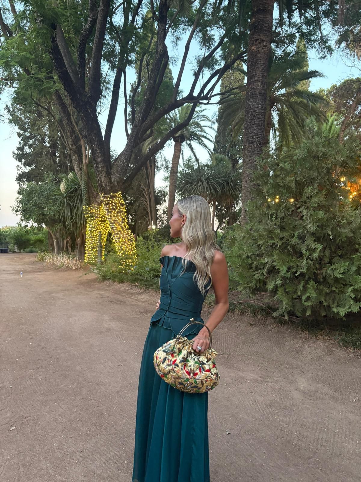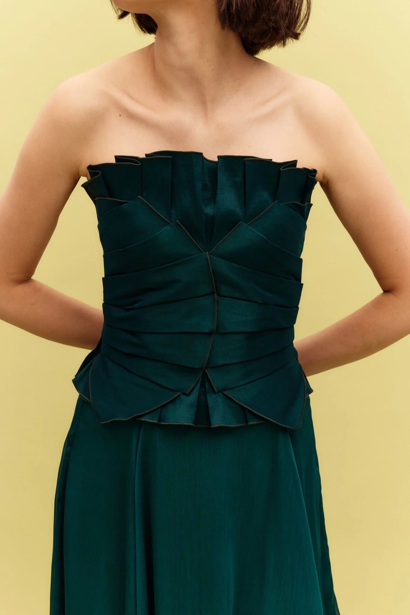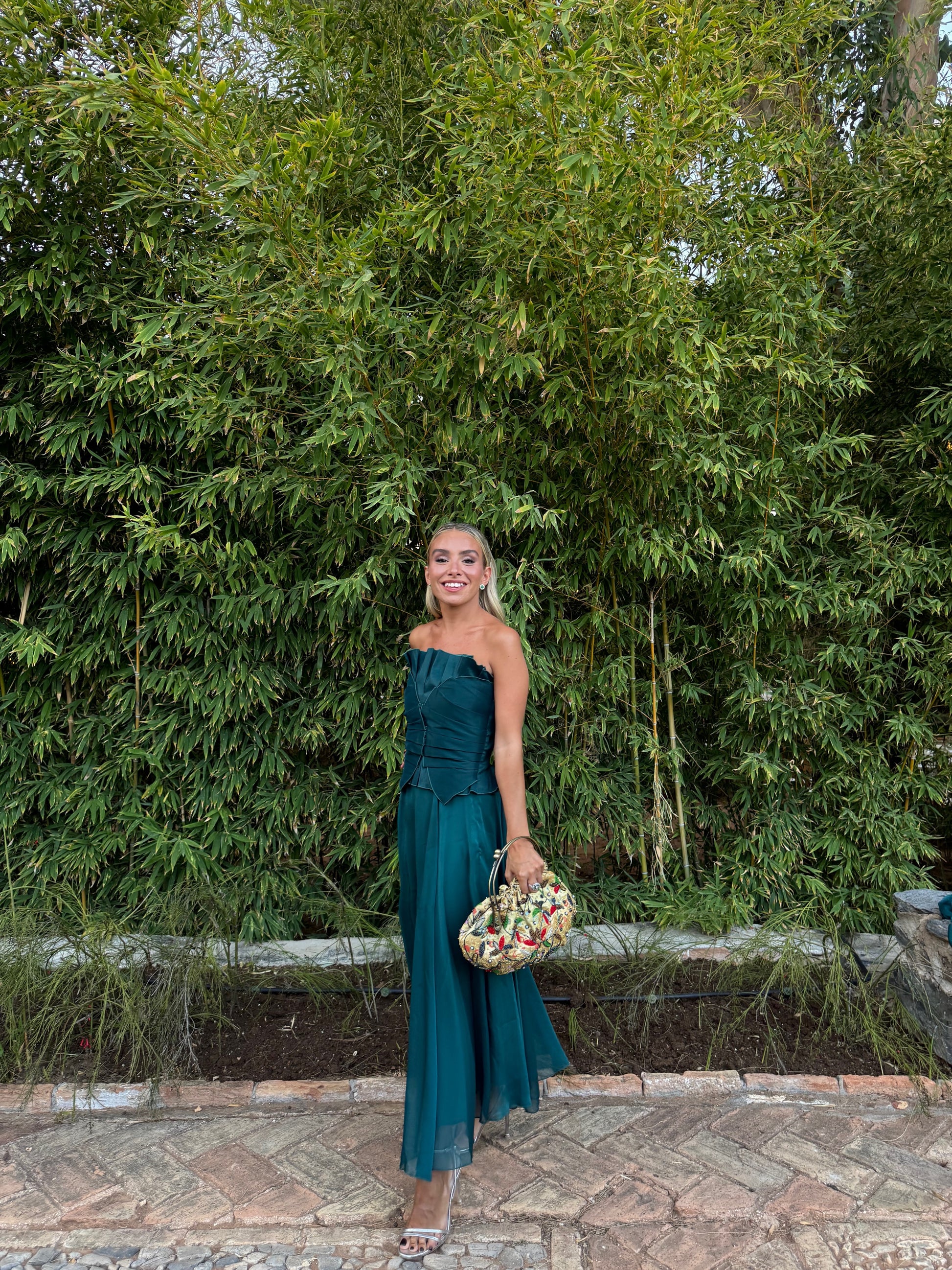 Conjunto dos piezas con cuerpo estructurado y drapeado. Escote palabra de honor. Falda fluida.Color verde esmeralda.