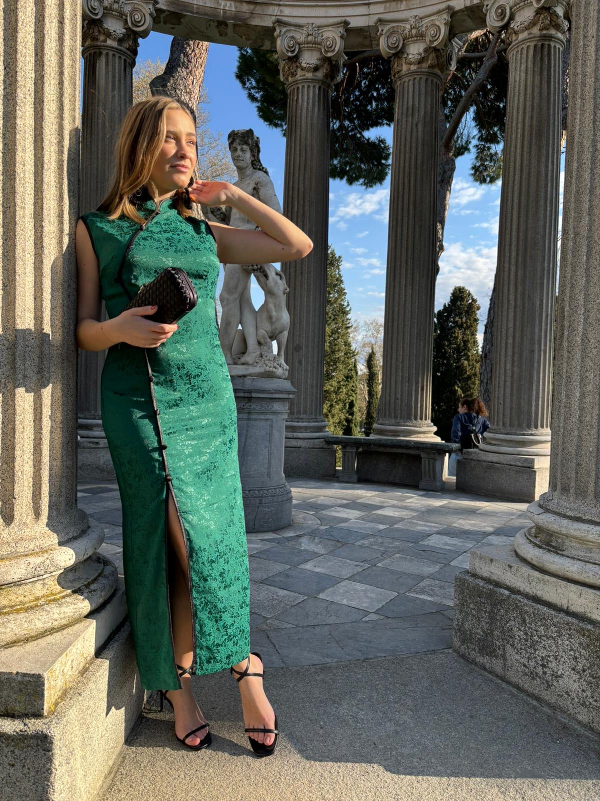 Vestido largo verde sin mangas. Largo de 140cm y cierre con cremallera trasera y detalle negro en las costuras.