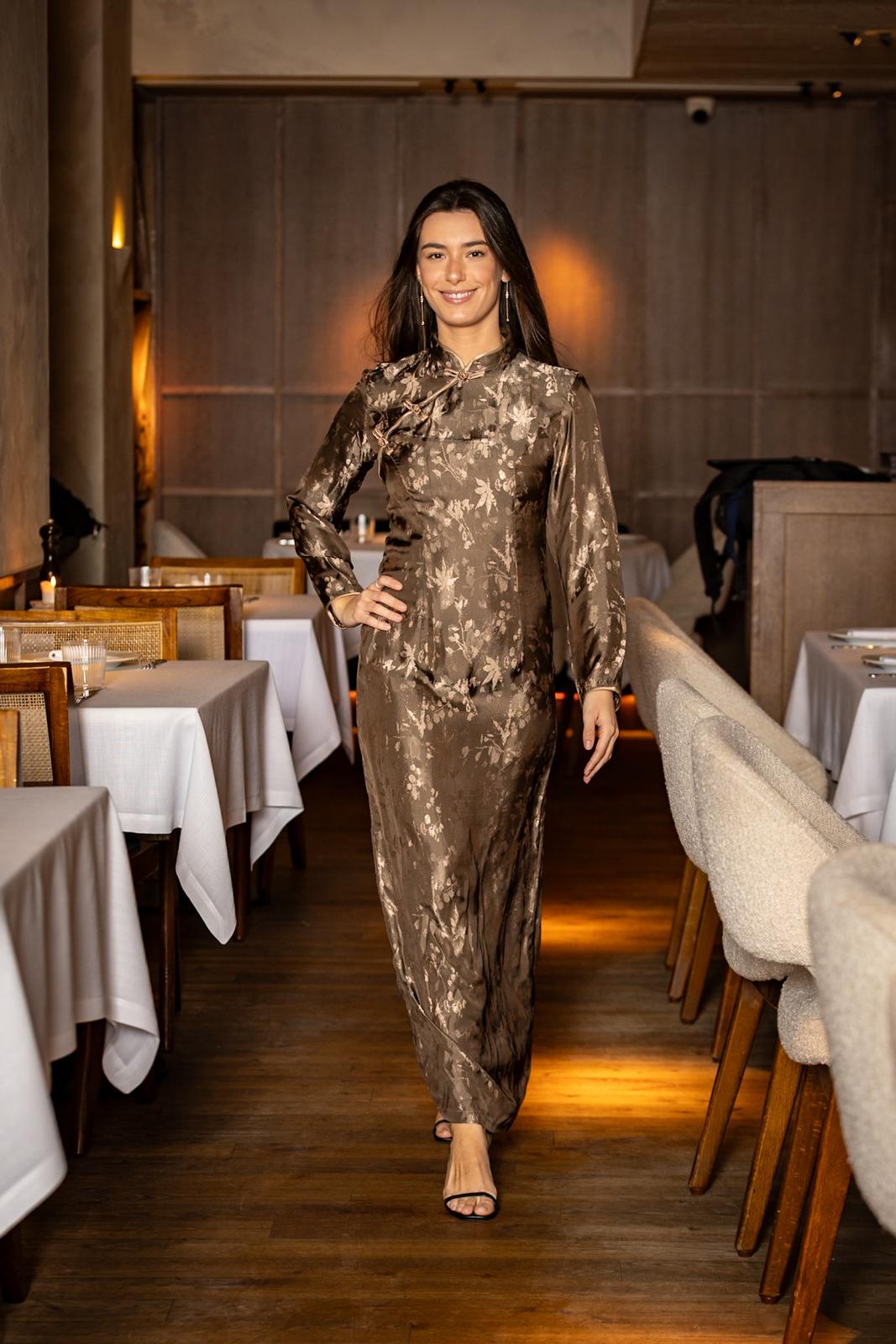 Vestido largo con estampado floral cuello Mao y manga larga. Largo de 145cm y cierre con cremallera lateral.