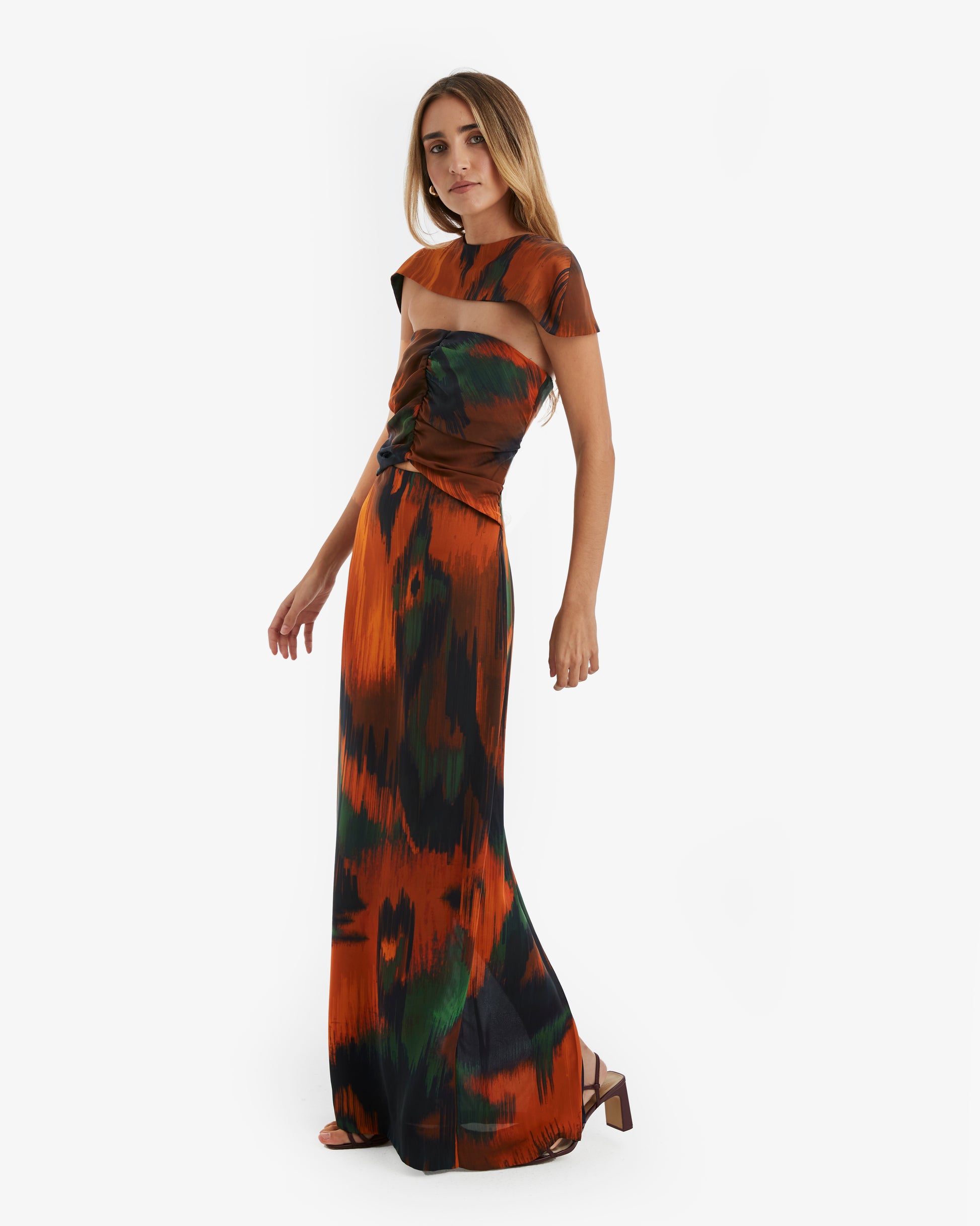 Vestido largo con estampado exclusivo . Escote en palabra de honor con ligero drapeado central en el top el cual se une a la falda. Lleva incluida una orginal capa caida en hombros y sujeta con un botón en la parte trasera.