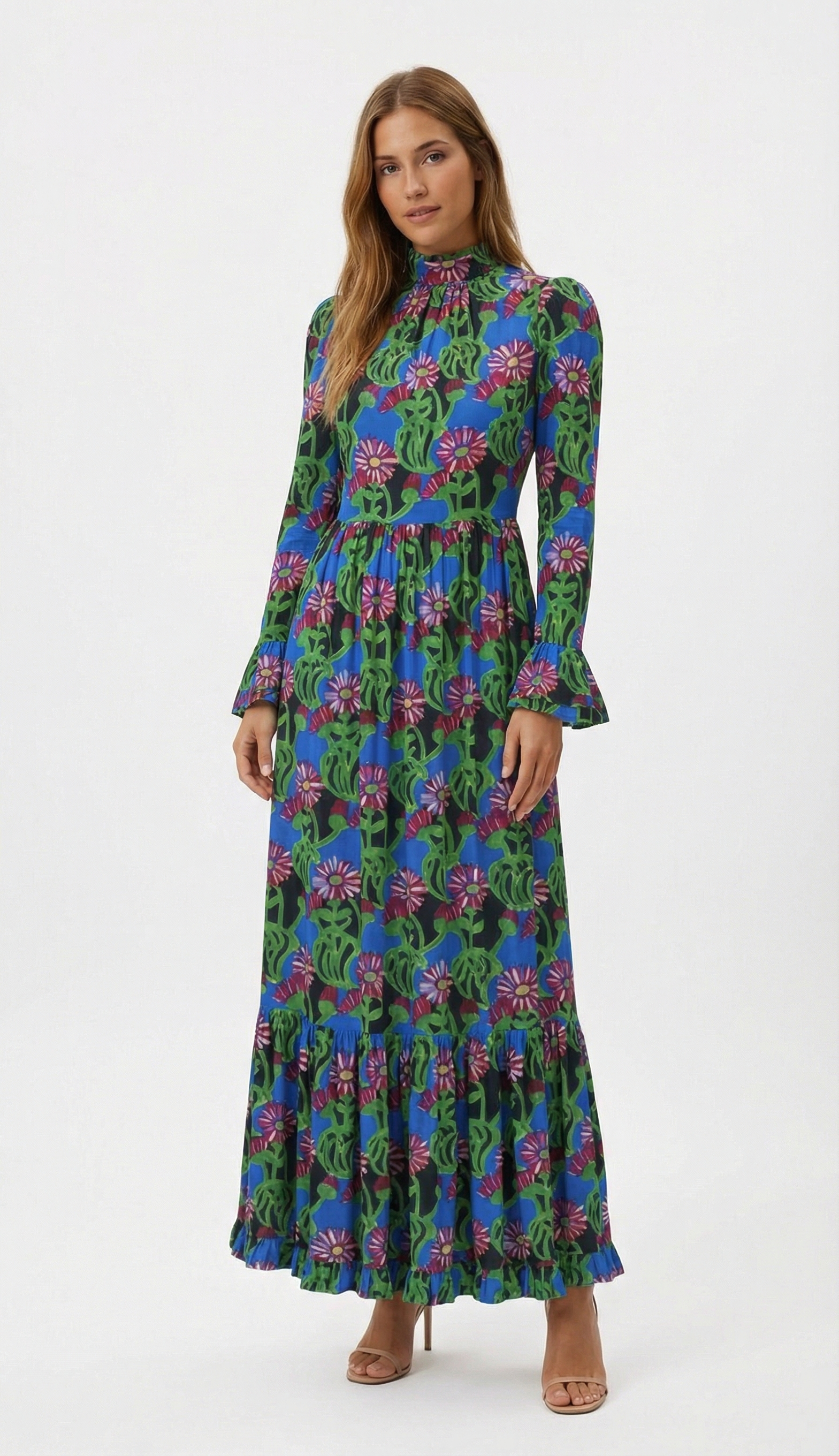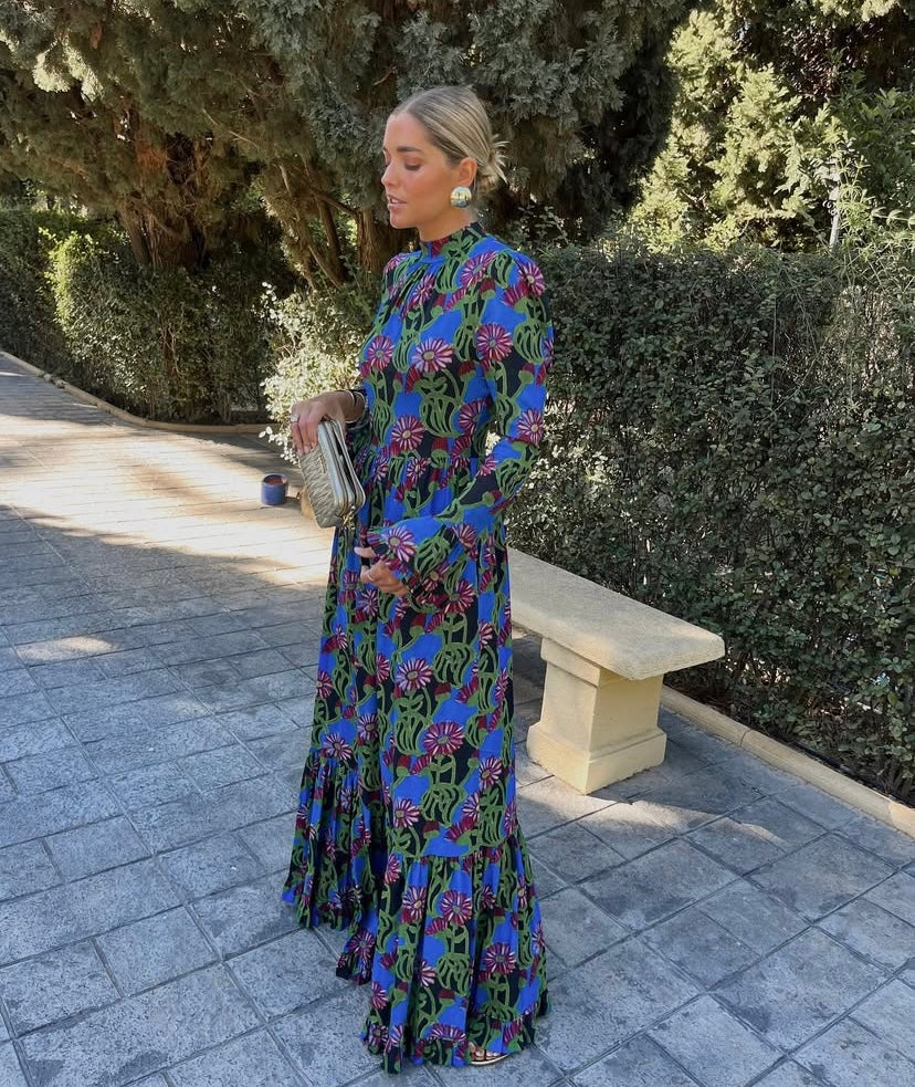 Vestido de sarga de seda sin forro y dobladillo acabado con plumas. Corte slim en los hombros y más amplio en las caderas, termina con un corte acampanado. Bolsillos laterales con abertura ocultos.