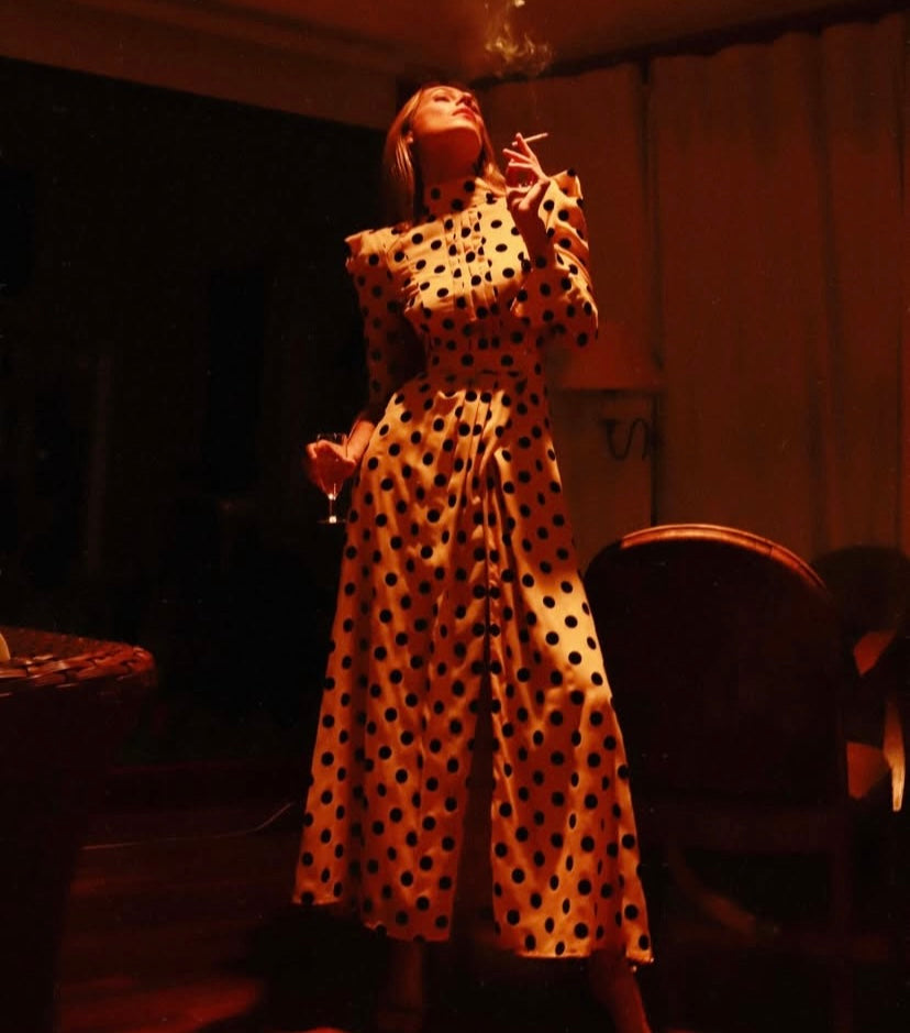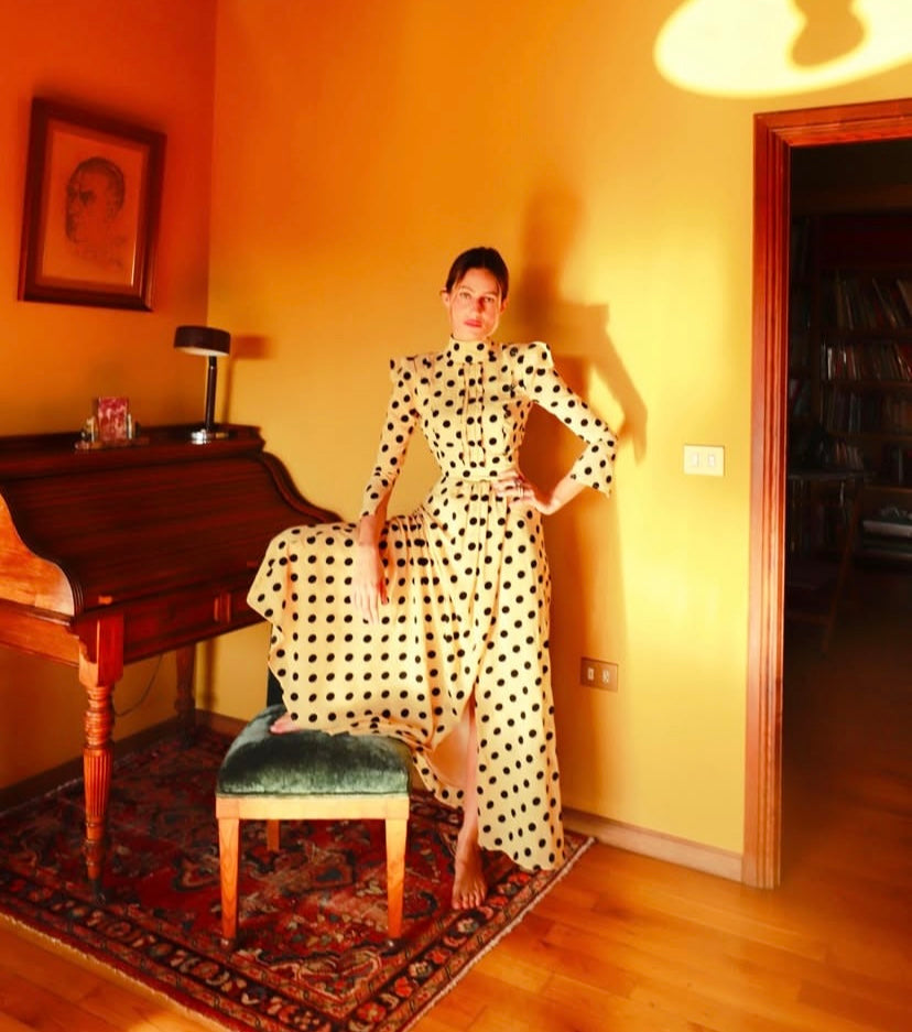 Vestido midi color mantequilla con estampado de lunares negros, cuello perkins y detalle frontal plisado Abertura lateral, cierra con cremallera y botones.