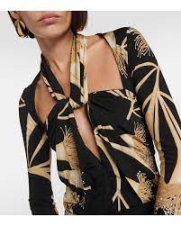 Vestido largo confeccionado en tejido fluido. Estampado bicolor en toda la prenda. Escote con lazada frontal . Manga larga. Corte recto con caída suave.