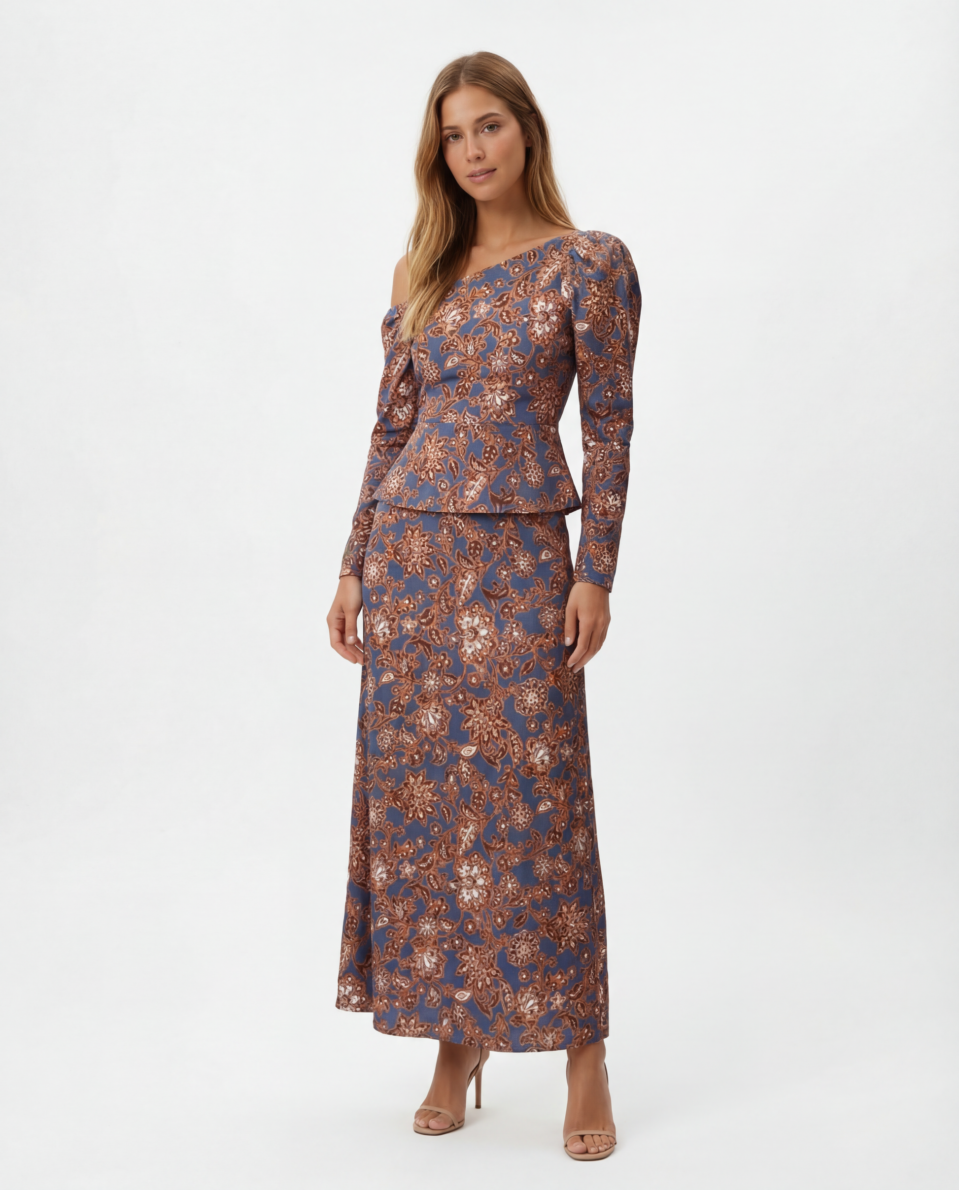 Vestido con cuerpo asimétrico, manga jamón y peplum en la cintura. La parte inferior se compone de una falda evasé con estructura triangular, aportando volumen y caída equilibrada.
