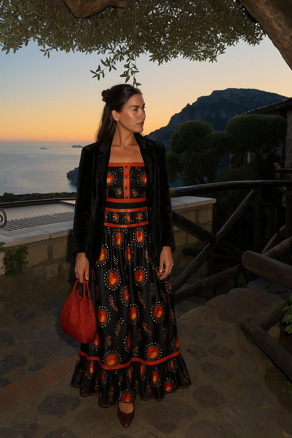 Vestido midi estampado de colores naranjas con tirantes y botones en la parte delantera. Bajo con volantes.
