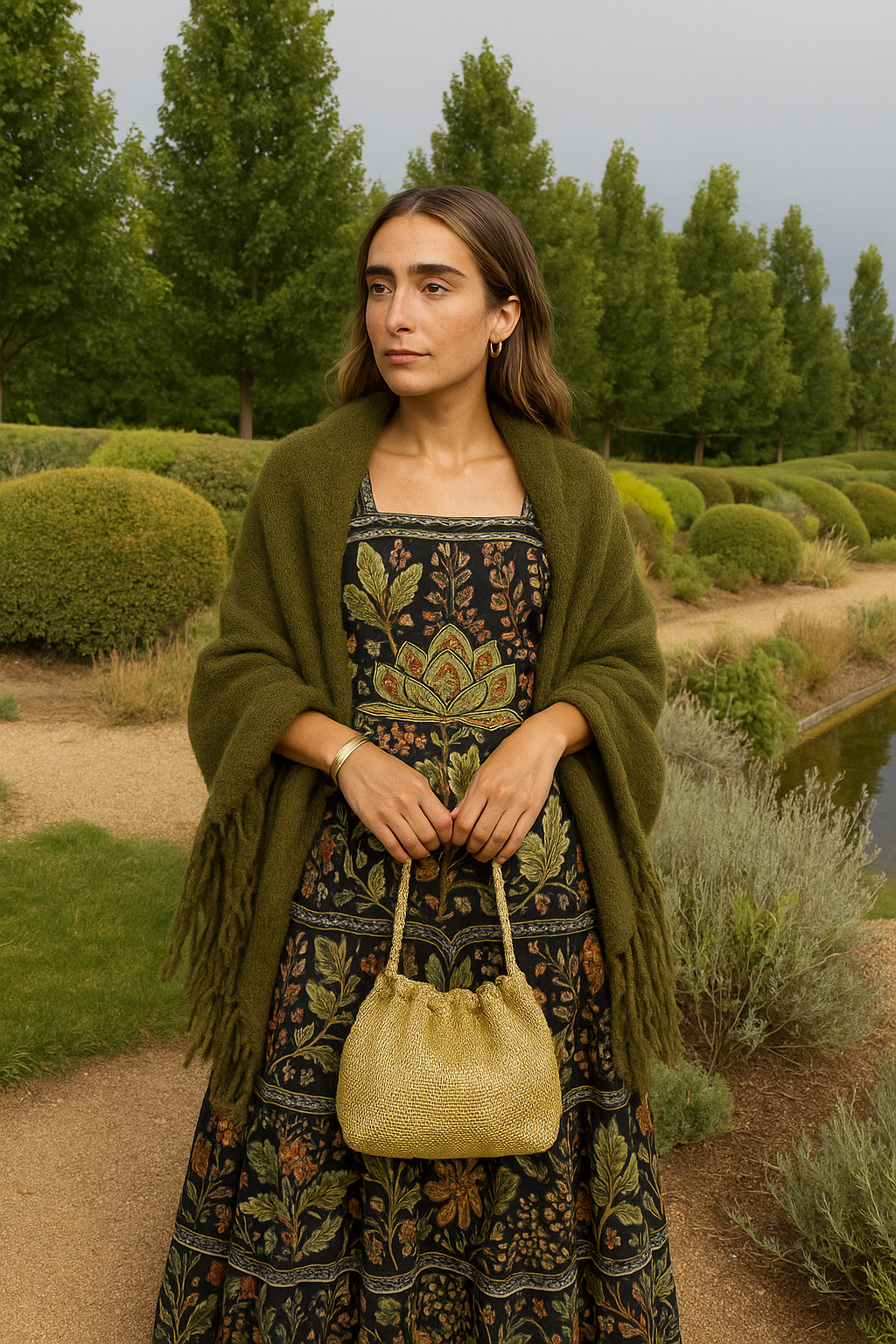 Vestido midi de tirantes anchos con estampado floral en tonos oscuros. Falda con volantes en el bajo de la prenda.