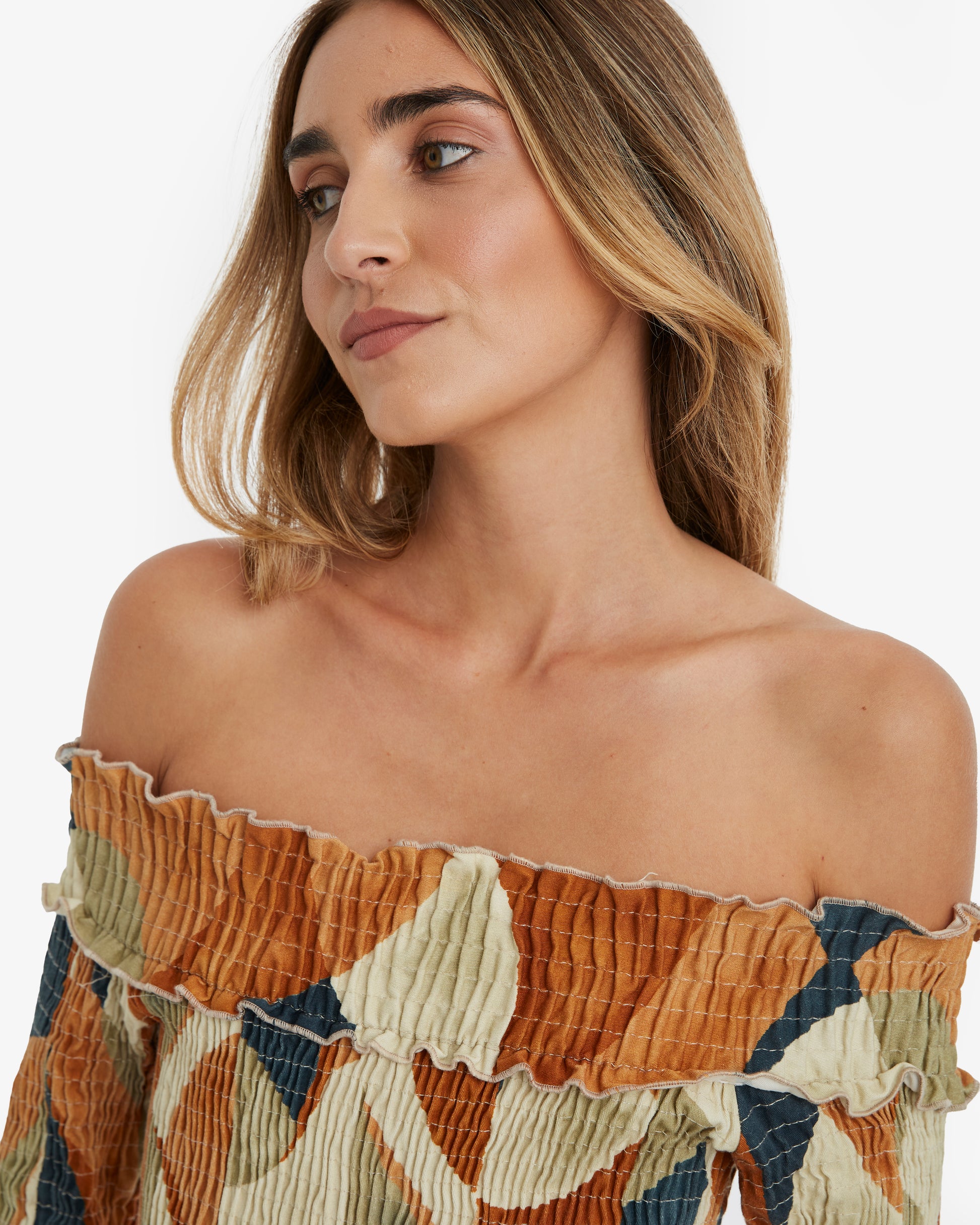 Vestido midi estampado con hojas caqui y marrón. Cuerpo fruncido en la parte superior y hombros al aire.