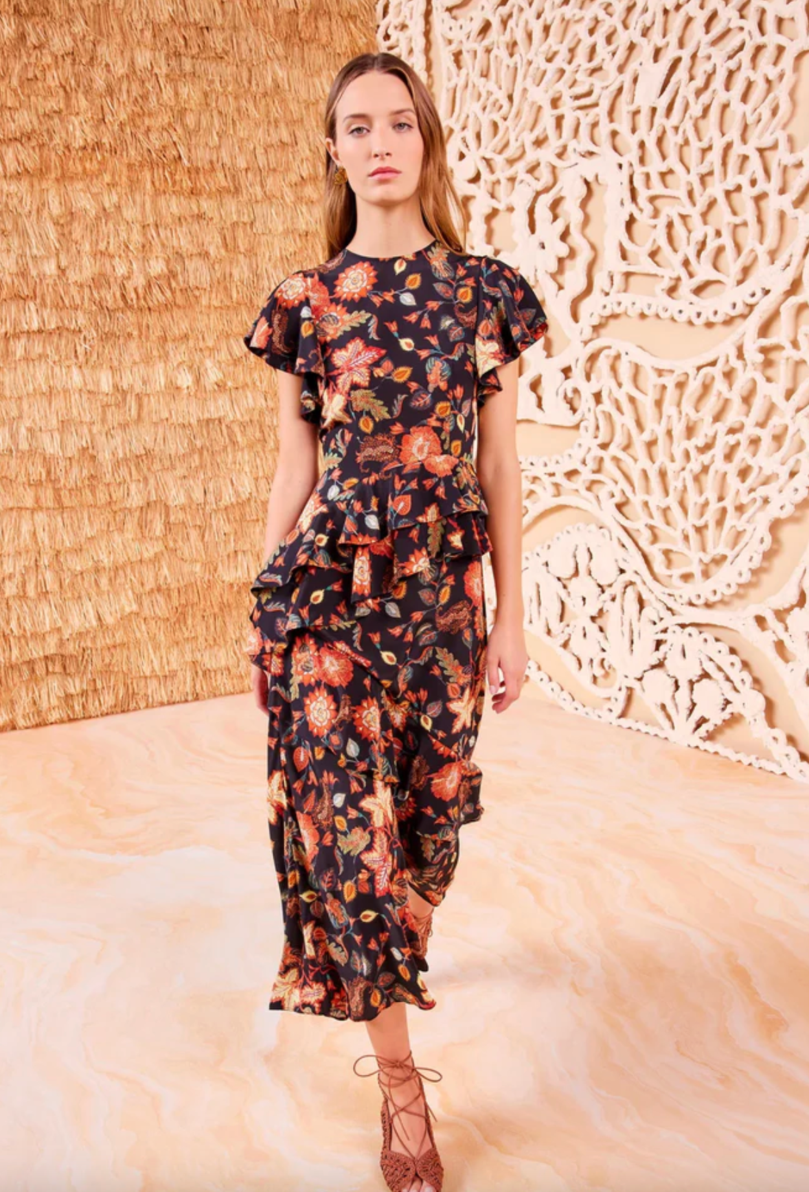 Vestido midi estampado con manga corta de volante, cintura marcada y falda con volantes.