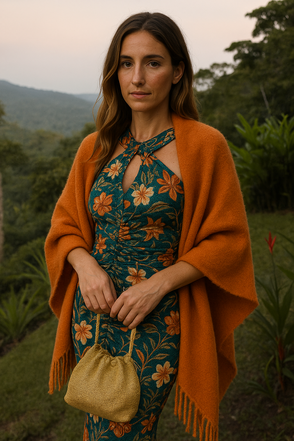 Vestido midi estampado floral en tonos turquesa y naranja, fruncido y con pequeña apertura en el pecho.