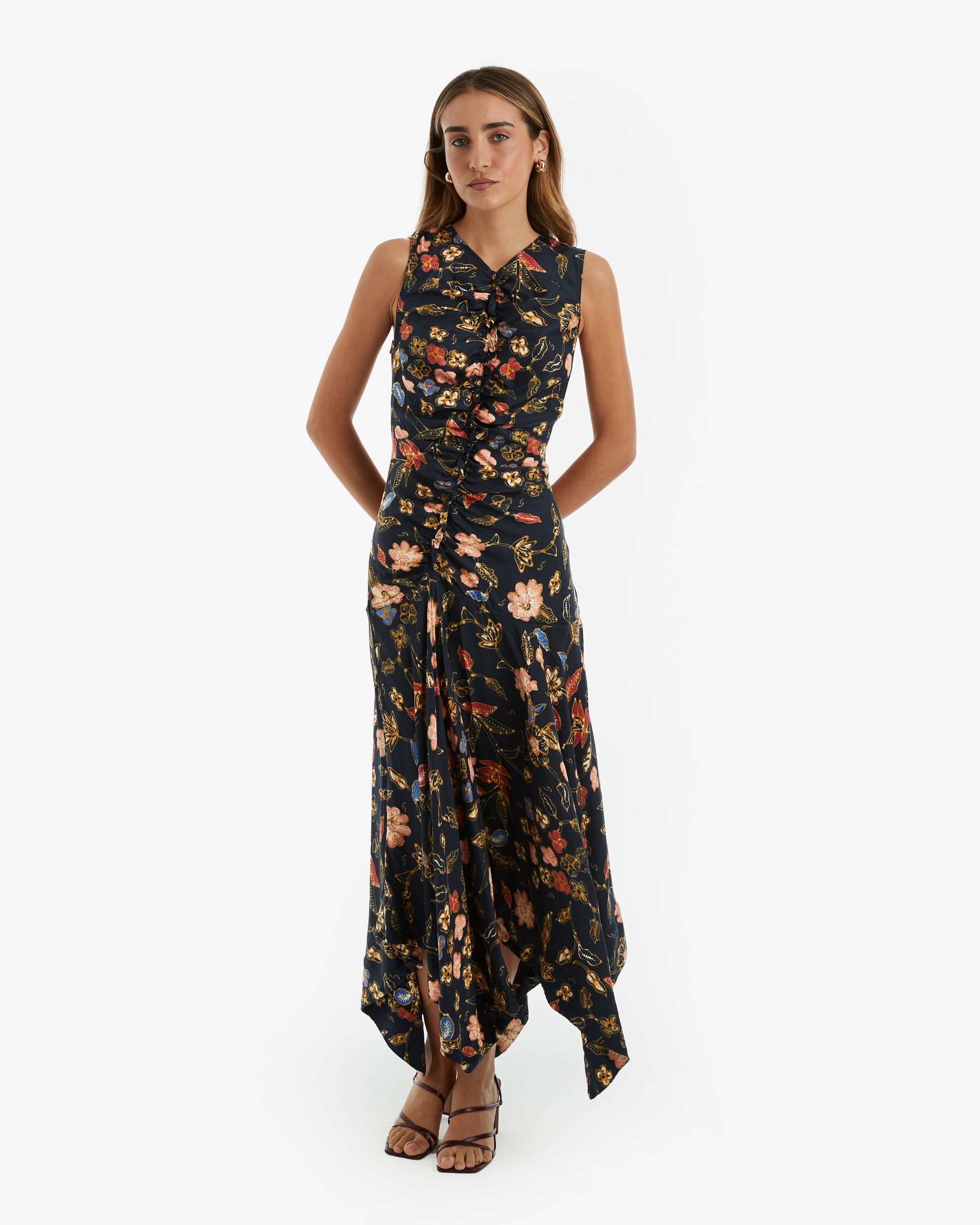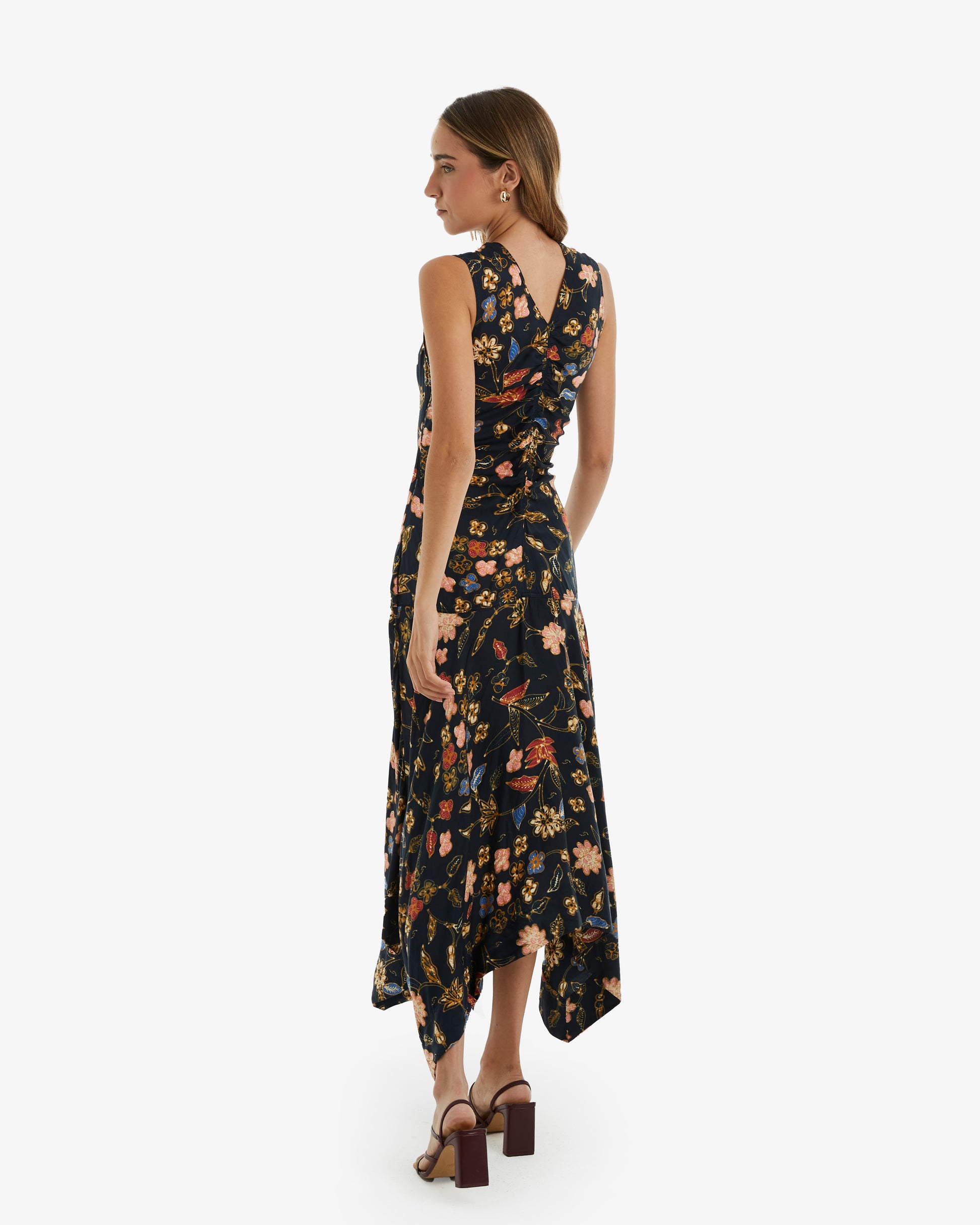 Vestido midi estampado floral en tonos azul marino y rosas , fruncido a lo largo del vestido.