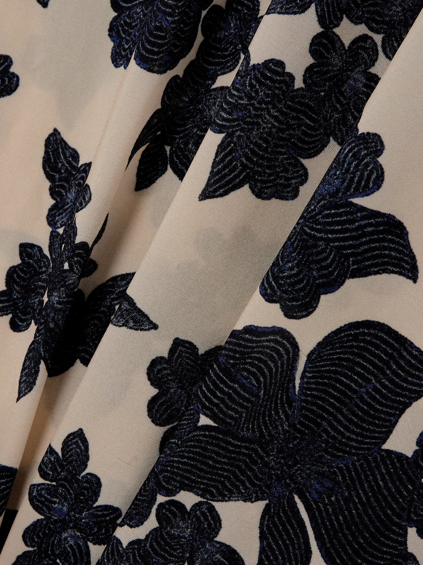 Vestido midi floral con estampado azul y beige sin mangas con fruncido en la parte superior.