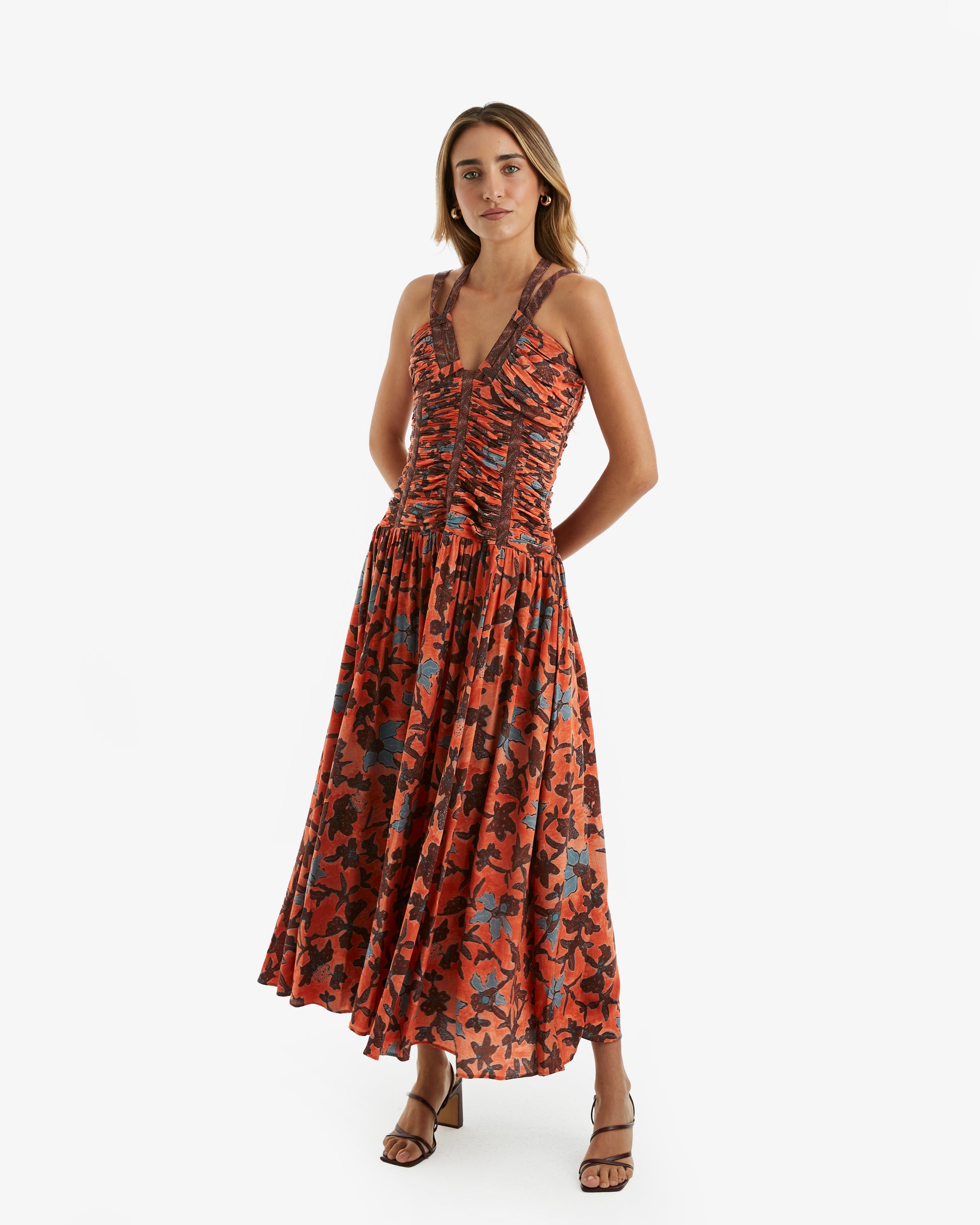 Vestido Midi de tirantes con estampado floral en tonos naranjas sobre marrón.