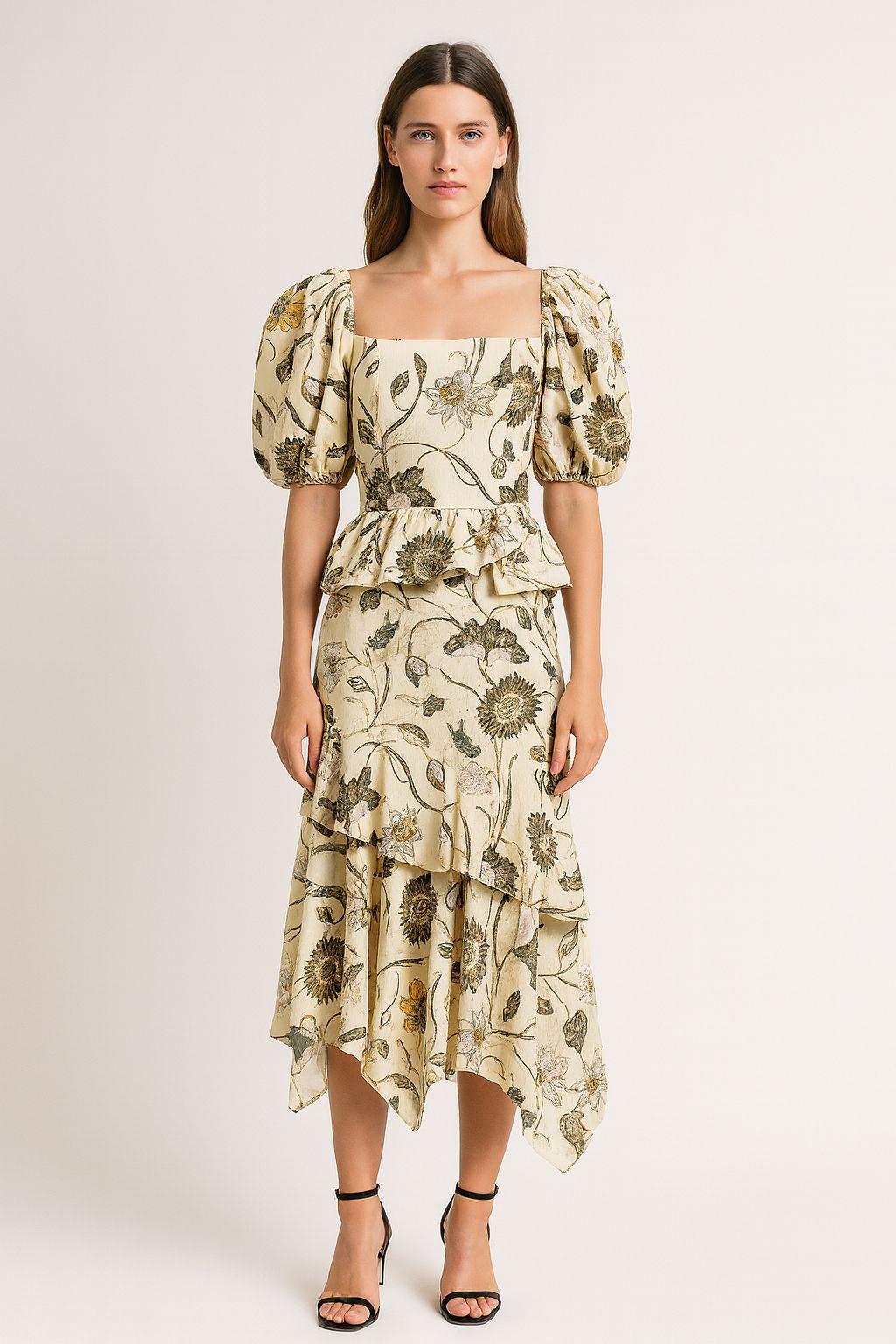 Vestido midi floral ceñido en la cintura. Corset interior y tirantes con lazo. Color Lima y flores en tonos violeta y morado. Tejido ligero con volantes en la parte inferior. d
